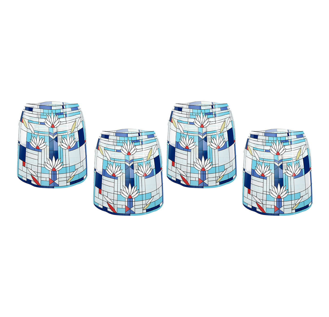 The delicate stylized glass design of waterlilies, is adapted from Frank Lloyd Wright’s drawing Waterlilies. This early example epitomizes Wright’s ability to incorporate themes from nature into his geometric designs and exemplifies his philosophy of “organic architecture”