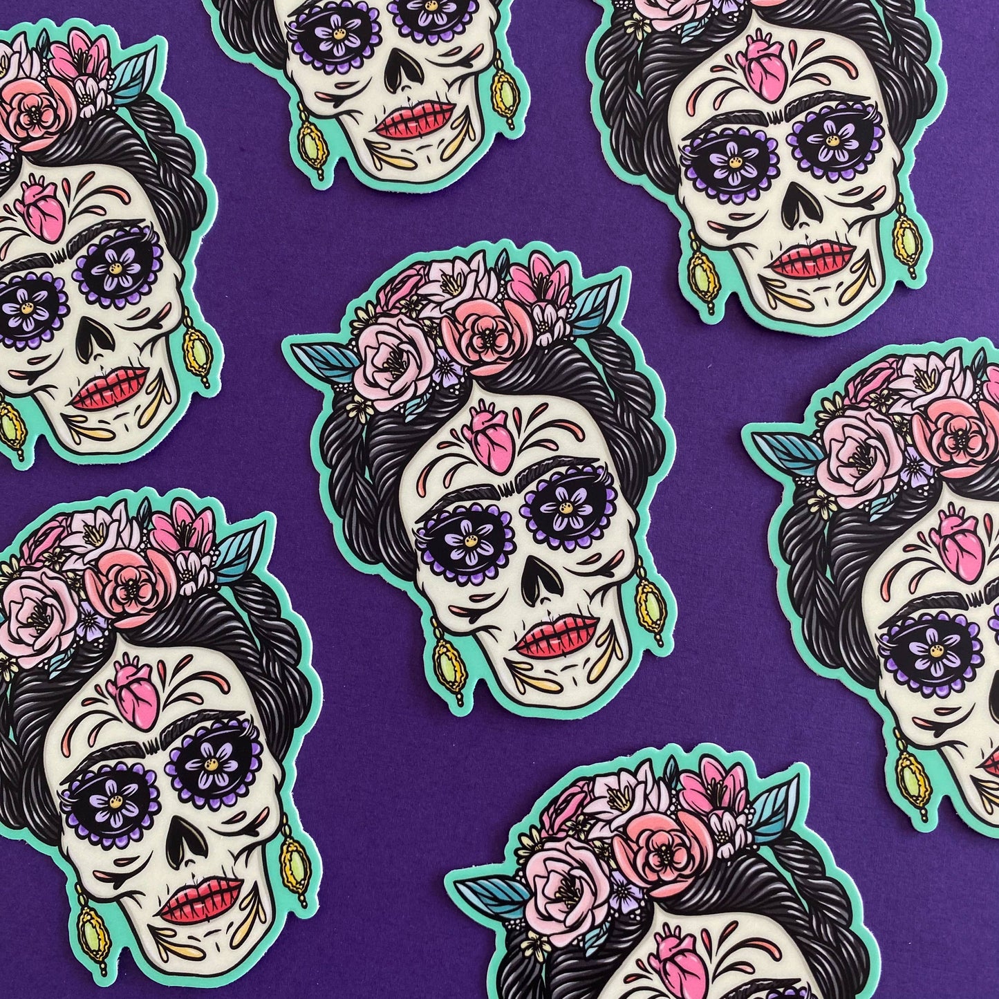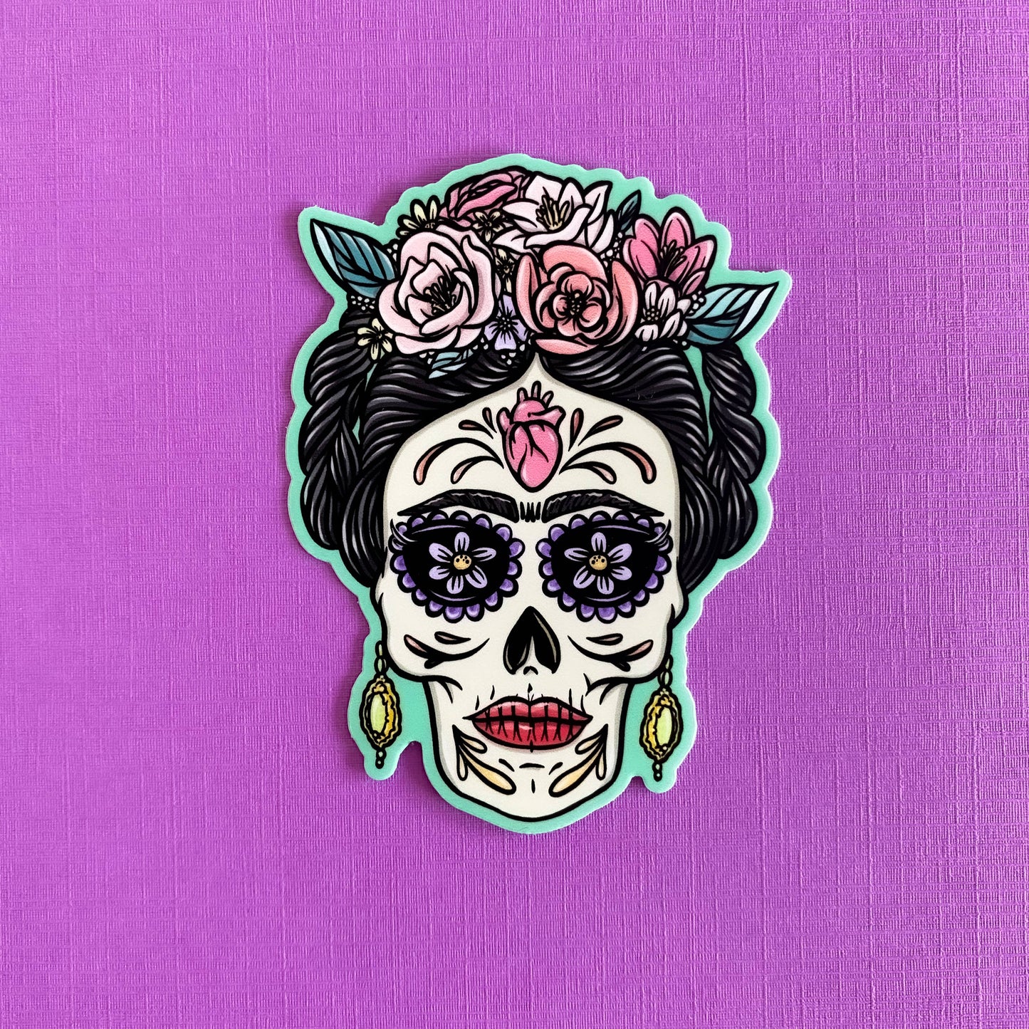 This Day of the Dead sticker is for all the art lovers out there. We had to pay homage to one of our favorite Mexican artists with this fun colorful sticker with a Día de Los Muertos twist. If you love the surrealism paintings by Frida Kahlo, then this is the sticker for you!